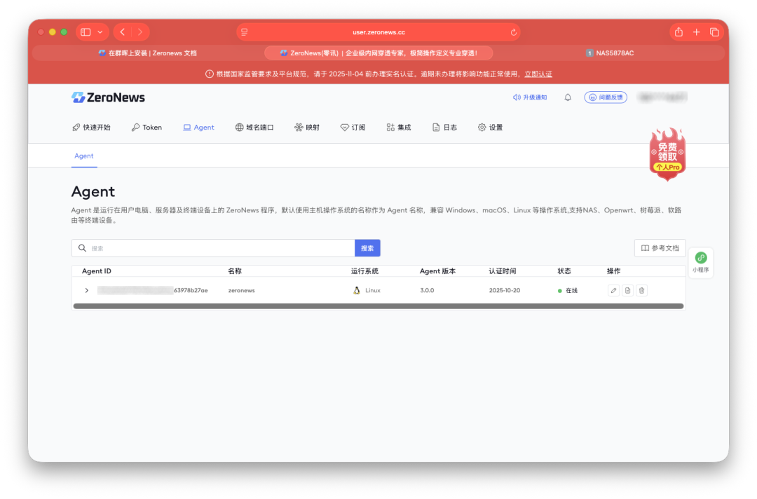 部署完毕后,在观望的控制台,「Agent」中便可看到设备了~