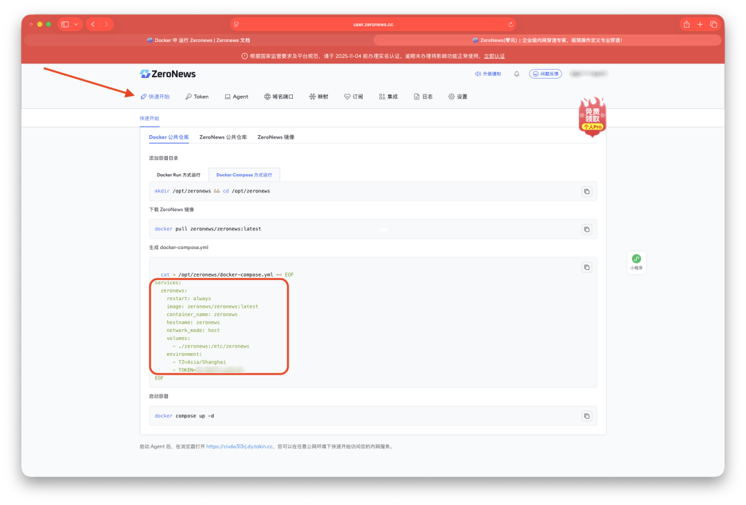 如下图所示,点击快速开始。会自动生成部署代码,其中环境变量中的Token每个人都不一样,可在顶部栏的「Token」中查看和管理。我们仅需要复制红框中的内容,Token也单独复制备用。