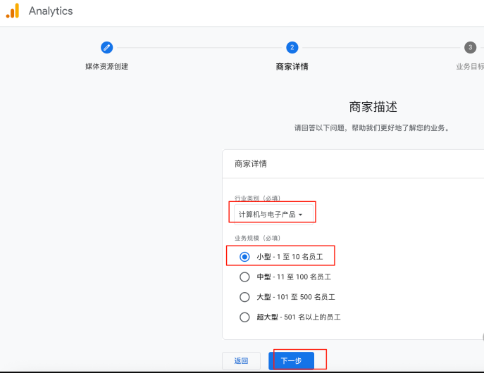 系统会引导你进入账户创建流程。首先需要填写账号名称(通常填写你的公司或网站名称),然后配置数据共享设置(通常保持默认即可),点击“下一步”。