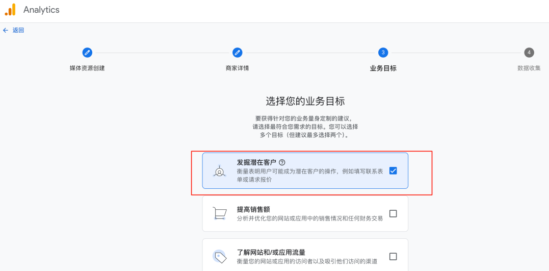 在“选择业务目标”页面,系统会列出多个选项(如“提高销售额”、“了解网站流量”等)。你可以根据主要需求勾选(建议最多选择两个),这有助于GA4提供更相关的报告。