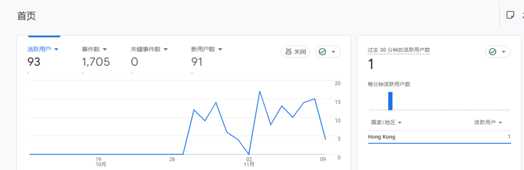 回到Google Analytics后台,点击左下角的“报告”(Reports),然后选择“实时”(Realtime)报告。如果设置正确,你应该能看到至少有1个活跃用户(很可能就是你自己)。