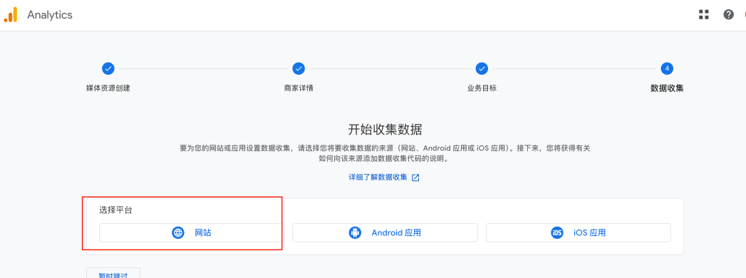 创建属性后,系统会提示你设置数据收集。由于我们是针对网站,请选择 “Web” 平台。