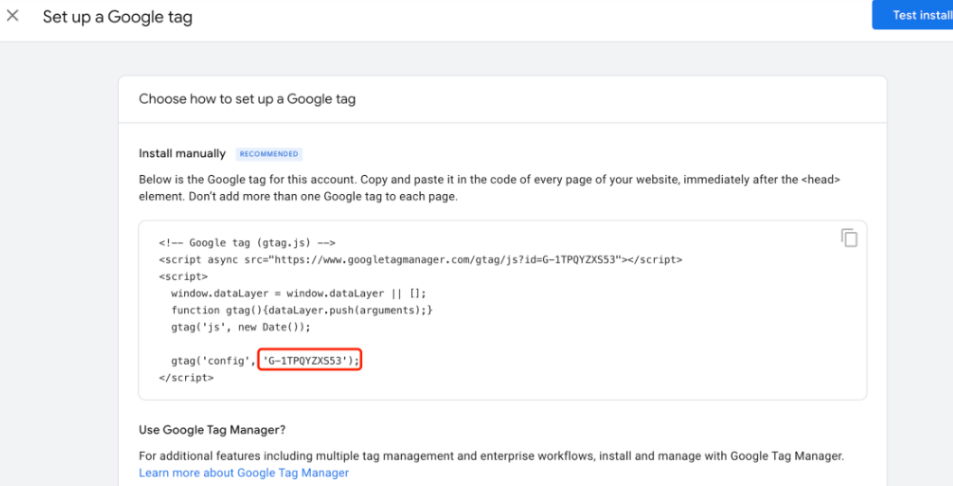 这是最关键的一步。创建数据流后,系统会跳转到流详情页面。请找到“Google Tag”(谷歌代码)部分,选择“手动安装”(Install manually)选项。