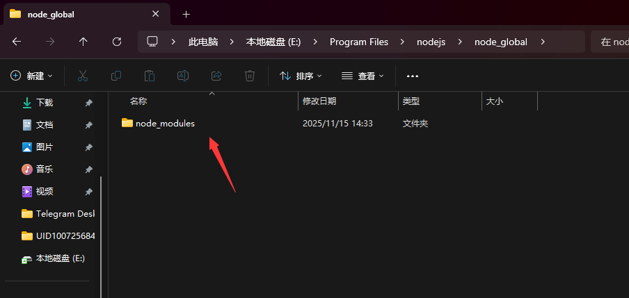 然后你就会发现【node_global】里多出了一个【node_modules】文件夹,Tips: 如果输入变量值之后没有自动创建【】文件夹,就在【node_global】下手动创建一个【node_modules】文件夹,再复制你创建的【node_modules】文件夹的路径地址到变量值