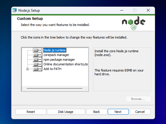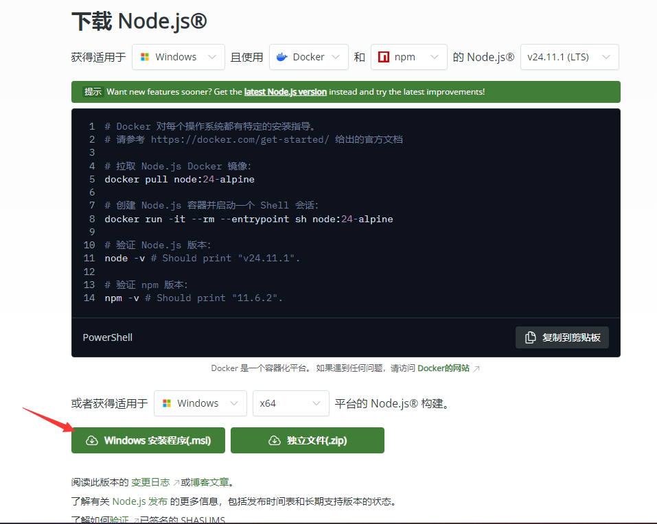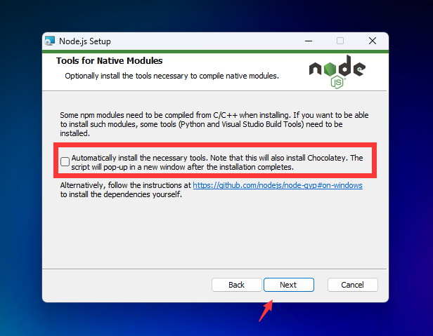 Tip:这是Node.js官方安装程序的推荐选项(默认已勾选),自动安装编译原生模块所需的完整工具链(Python、Visual Studio构建工具),避免后续开发中遇到”node-gyp”编译错误的问题。特别适合需要安装带有C++扩展的npm包(如bcrypt、sqlite3等)。因为我的系统已经您的系统已经安装了完整的Visual Studio和Python开发环境,所以没选这个。