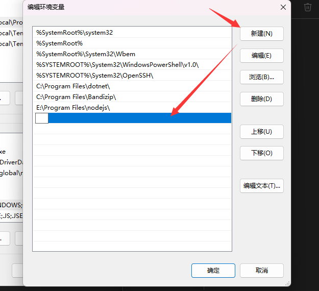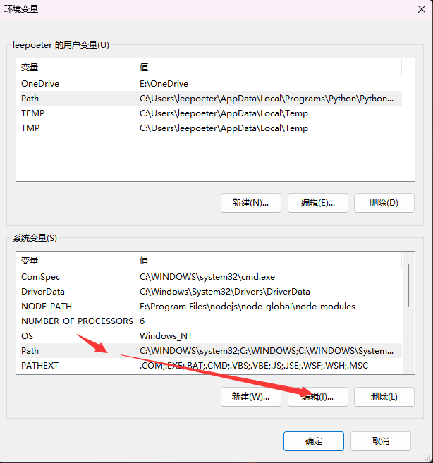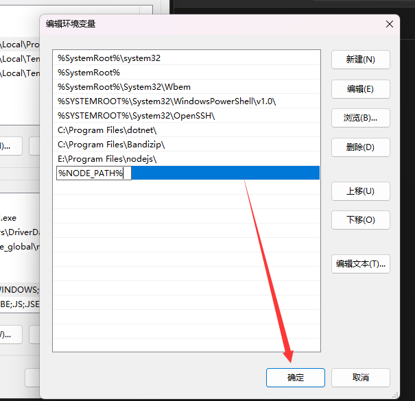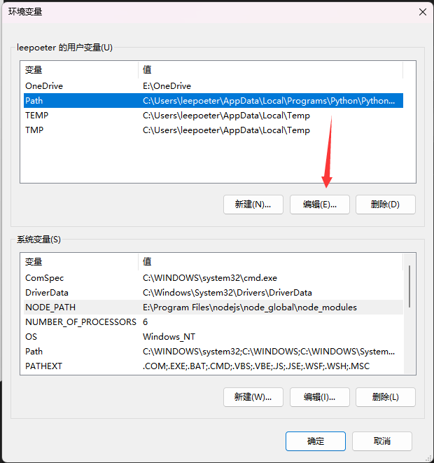 ⑤在【系统变量】中选择【Path】点击【编辑】添加【%NODE_PATH%】,随后一直点击【确定】