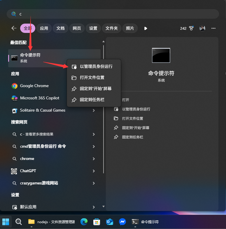 Tips: 使用管理员身份运行cmd的方法 :点击左下角【开始】菜单,在搜索区域输入“命令提示符”,然后点击【以管理员身份运行】