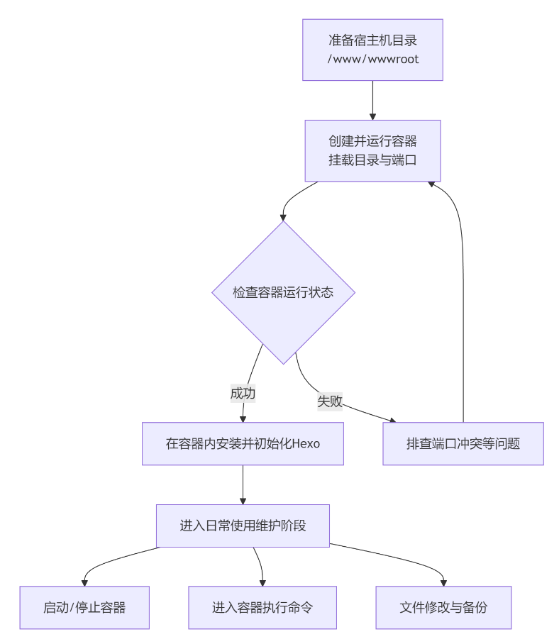 整个流程的核心思路是:通过目录挂载,将宿主机的 /www/wwwroot目录与 Docker 容器内的 Hexo 工作目录关联起来,从而实现环境隔离、数据持久化和便捷管理。