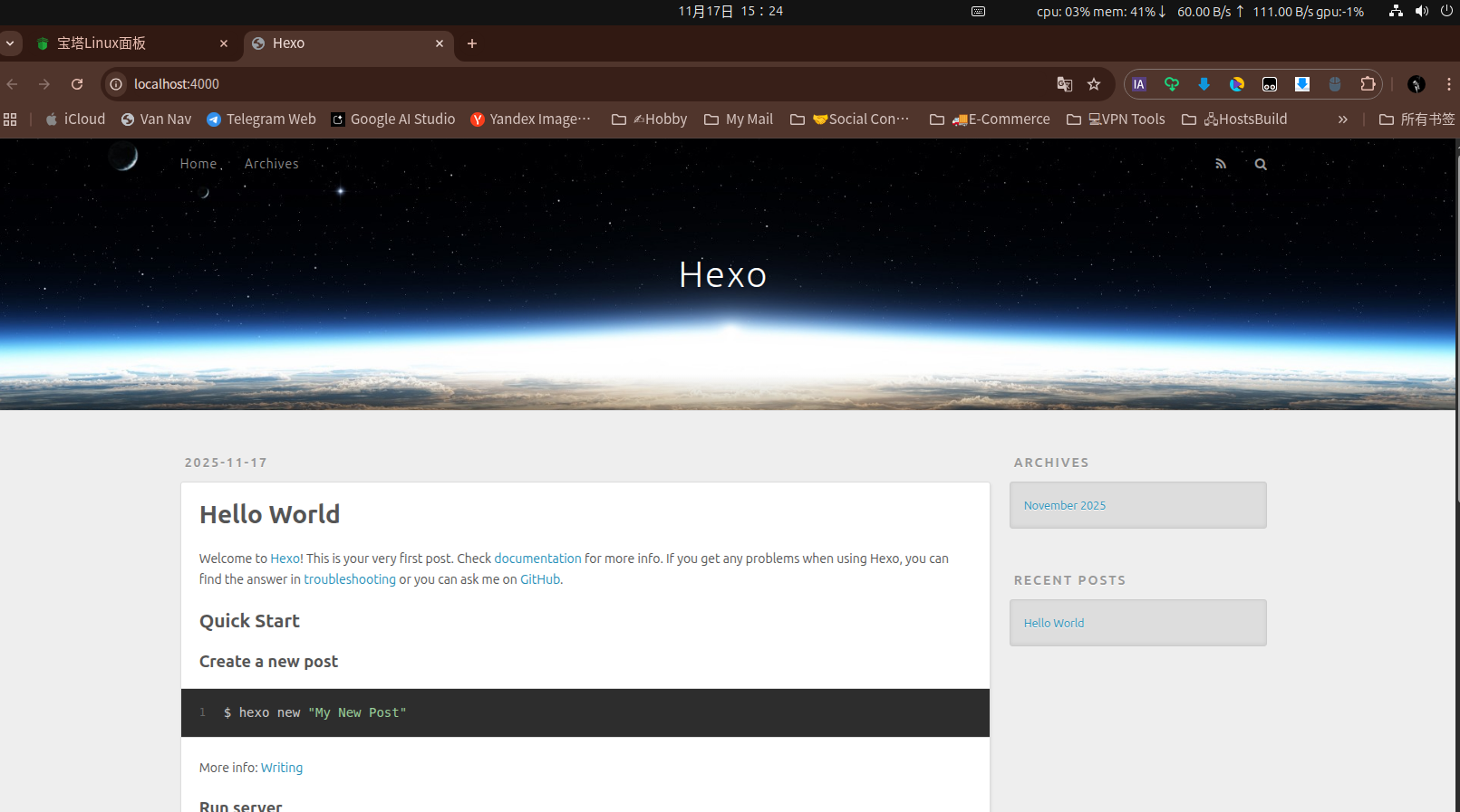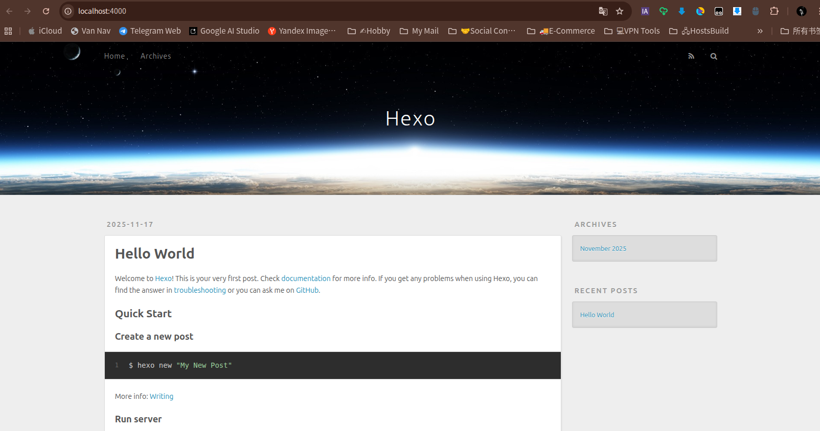 现在,你可以在宿主机的浏览器中访问 http://你的服务器IP:4000来查看 Hexo 博客了!
