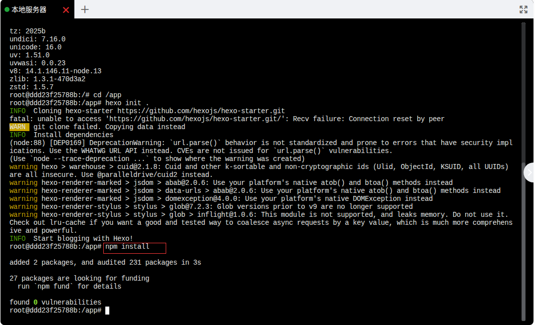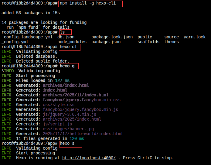 下面就基于已经拉取的node镜像启动一个容器在这个容器内安装HEXO,并将宿主机的一个目录“映射”到容器内,作为 Hexo 的工作目录。这样,所有 Hexo 项目文件都会保存在宿主机上,即使容器被删除,你的博客源码也不会丢失。更方便管理。