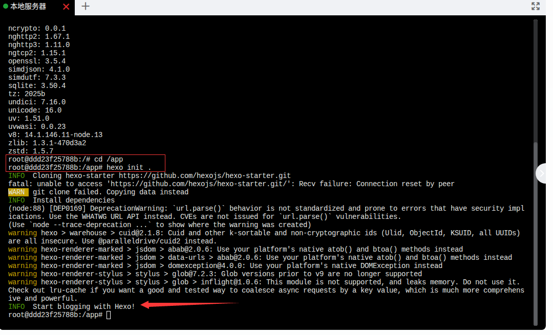 如果成功,会显示 Hexo 和 Node.js 的版本信息。
