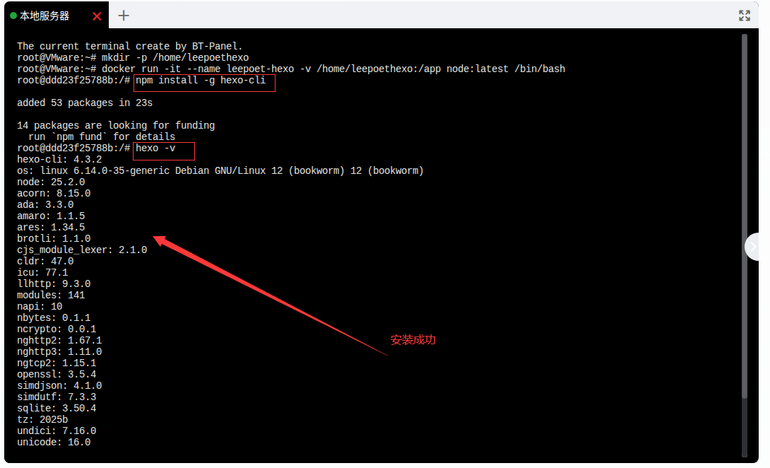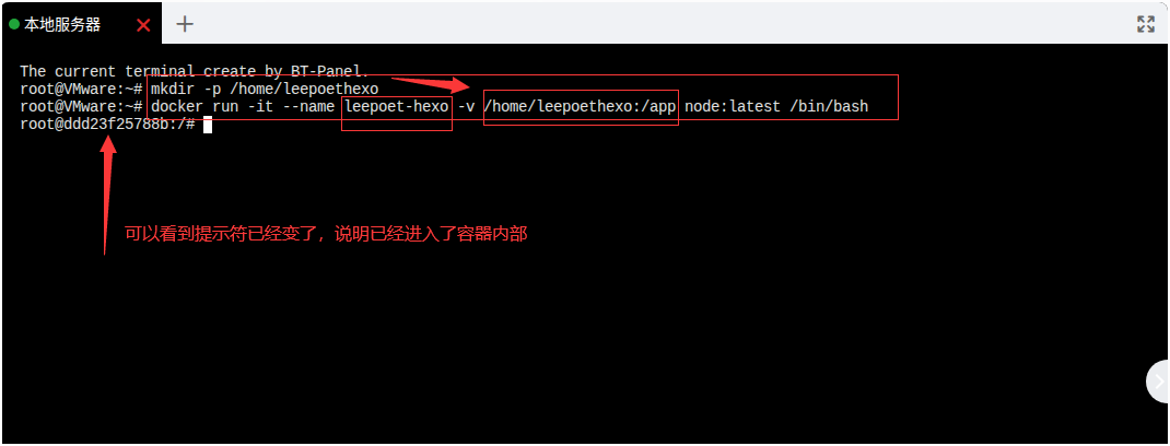--name leepoet-hexo:为你创建的容器起一个有意义的名字,比如我取的是leepoet-hexo。-v /home/leepoethexo:/app:这是最关键的部分!-v参数将宿主机的/home/leepoethexo目录“挂载”到容器内的/app目录。两者内容完全同步。node:latest:指定使用你已有的 node 镜像。/bin/bash:启动容器后运行 shell,让你可以输入命令。