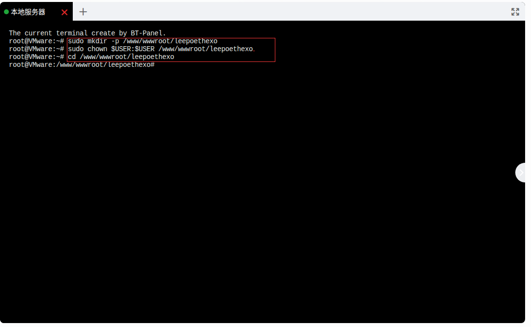 sudo chown $USER:$USER /www/wwwroot/leepoethexo # 将目录所有者改为当前用户,方便操作