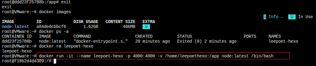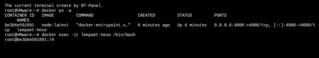docker start -i leepoet-hexo - 进入正在运行的容器(另开一个终端):