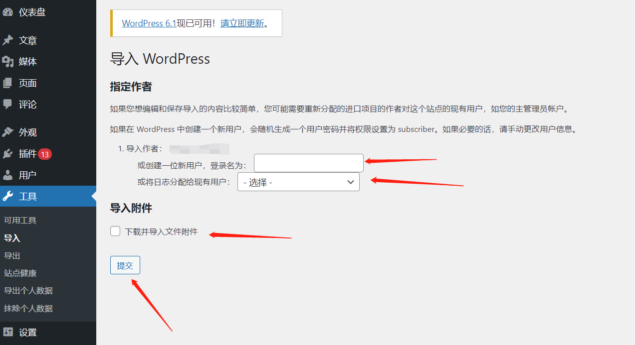 处理附件:取消勾选「下载并导入文件附件」(因已手动迁移附件),点击「提交」开始导入。完成后会显示成功提示,此时文章已全部迁移至新网站。