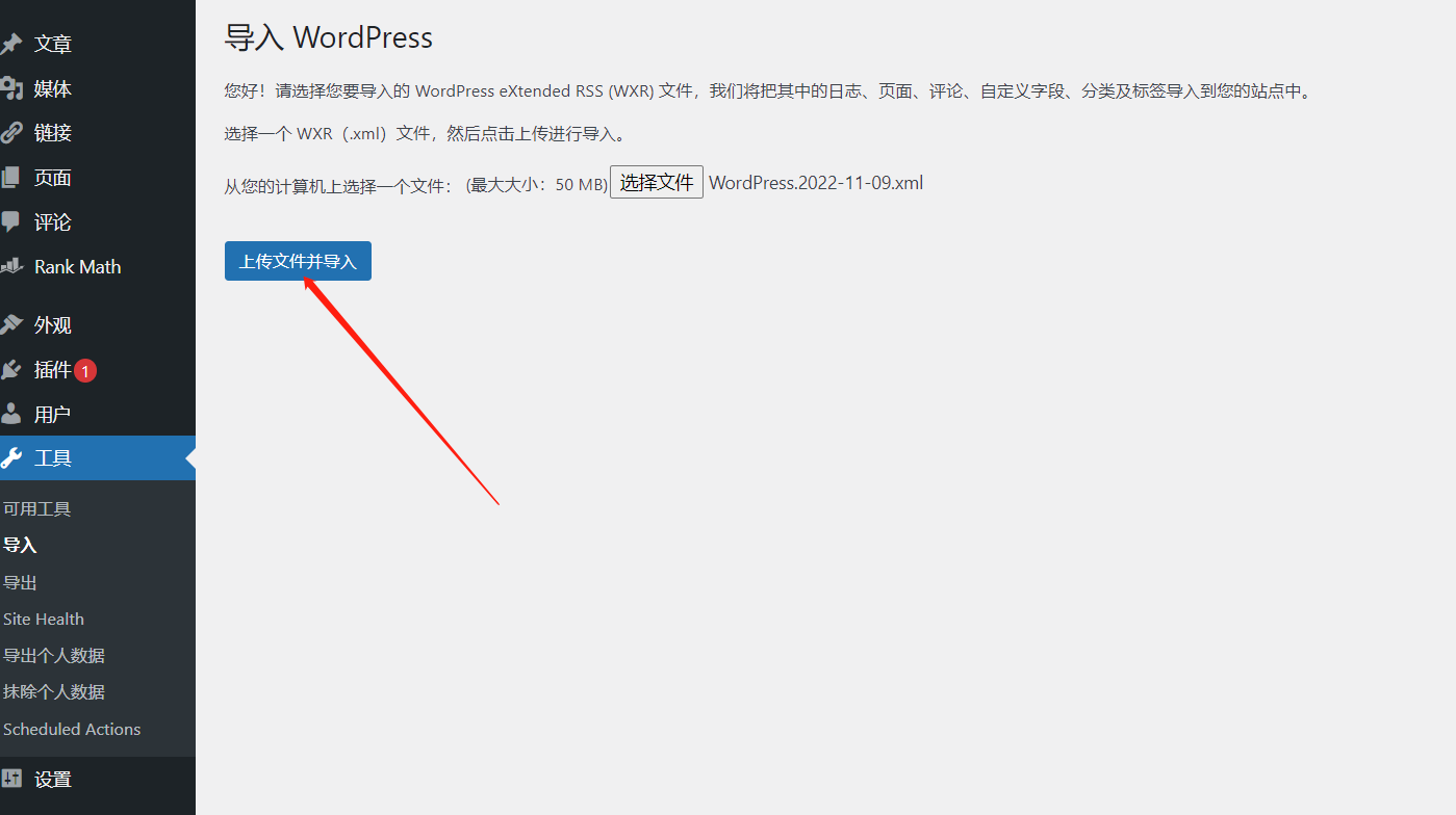 上传文件:选择修改后的XML文件,点击「上传并导入」。系统会提示分配作者,可选择现有用户或创建新账号。