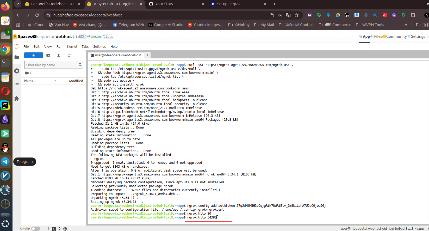 添加完后会提示:Authtoken saved to configuration file: /home/user/.config/ngrok/ngrok.yml,然后直接使用ngrok穿透BT的端口
