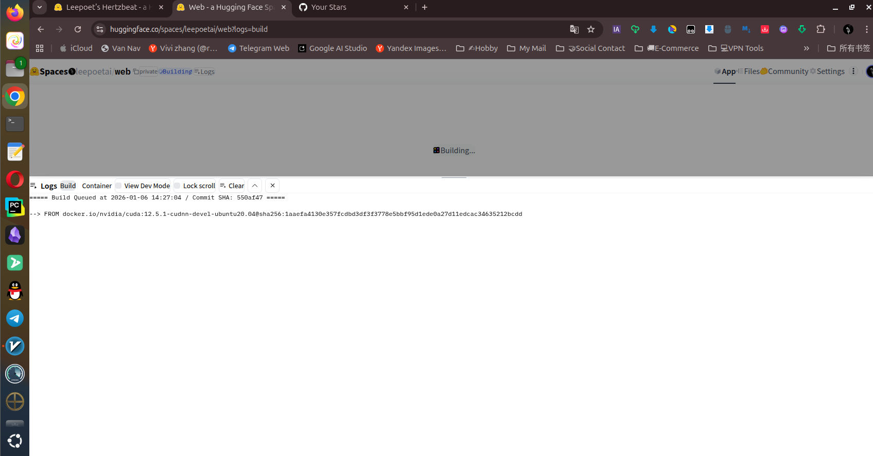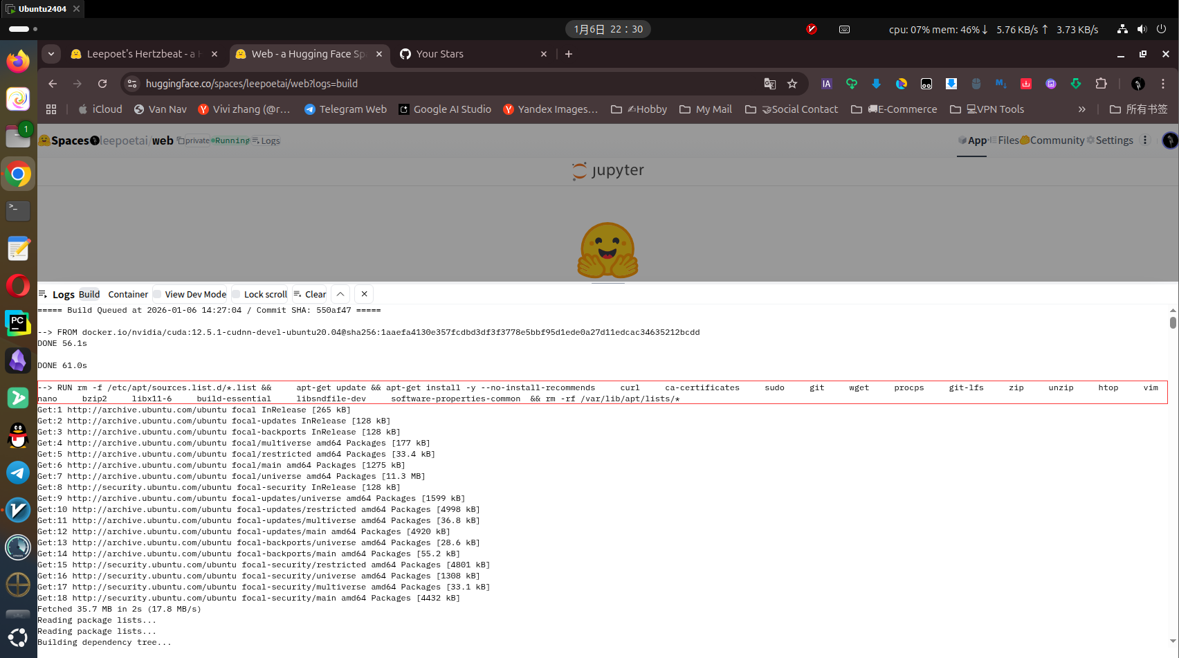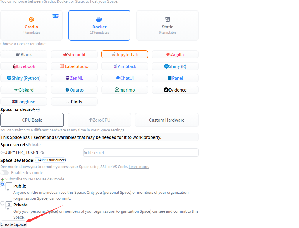 选择完后直接create space,直接下面的流程,进入自动building流程,大概需要等3分钟左右,选择jupyterlab的好处是因为它会直接装Ubuntu20.04系统,方便