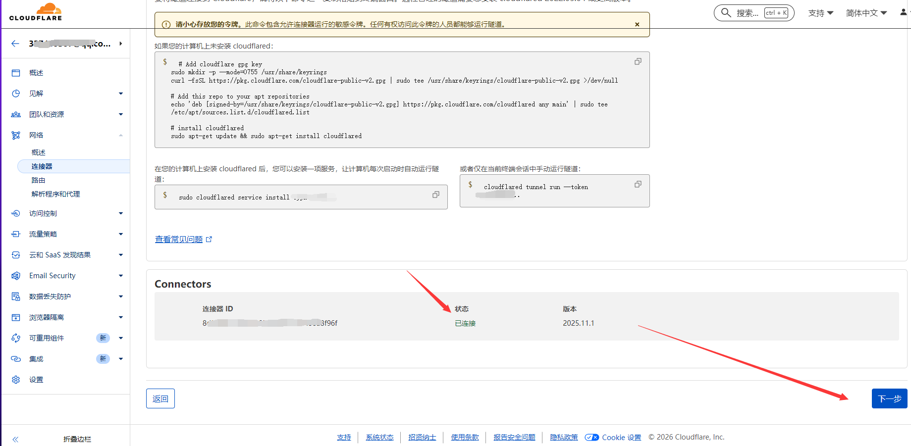 安装成功后,回到https://one.dash.cloudflare.com/面板,可以看到状态是已连接了,然后下一步