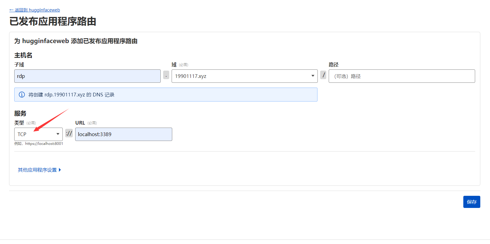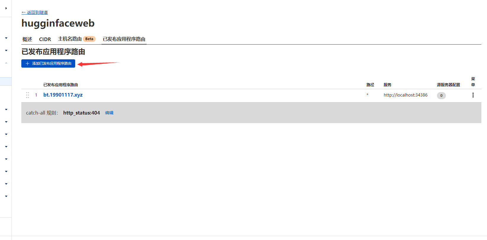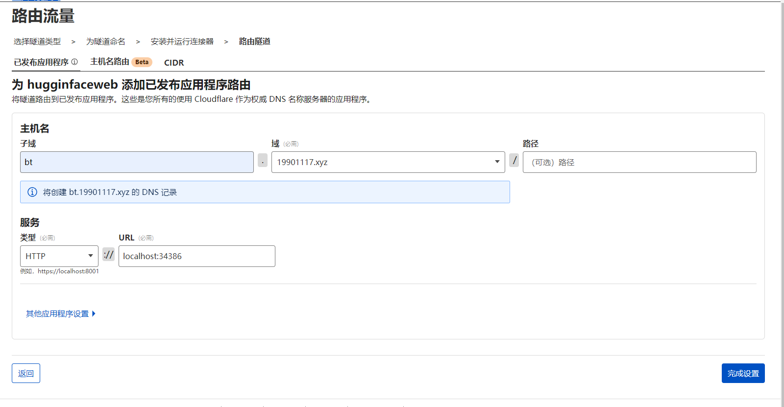 设置穿透的端口,这里用bt的端口34386进行穿透到bt.19901117.xyz。(*注:首先要先把自己的自定义域名先托管到cloudflare)